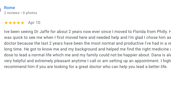 Dr. Scott Jaffe is committed to your recovery from opioid addiction and alcohol dependence. We are able to provide the addiction treatment you need to be combined with one on one counseling services to give you the tools for a successful recovery. Our healthcare specialists create a warm and welcoming environment where you are our number one priority. We believe in listening to you and your needs in order to understand how to best support your health and well-being. The cornerstone of our practice is nonjudgmental care that recognizes the courage it takes for those reaching out for help. Living with opiate addiction is a constant struggle and can take a toll on your life, your family, and your mental health. We are here to help you overcome this burden, so you can truly have the life you were always capable of living. Contact us today to learn more about how we can help. And be sure to check out our Google Reviews.